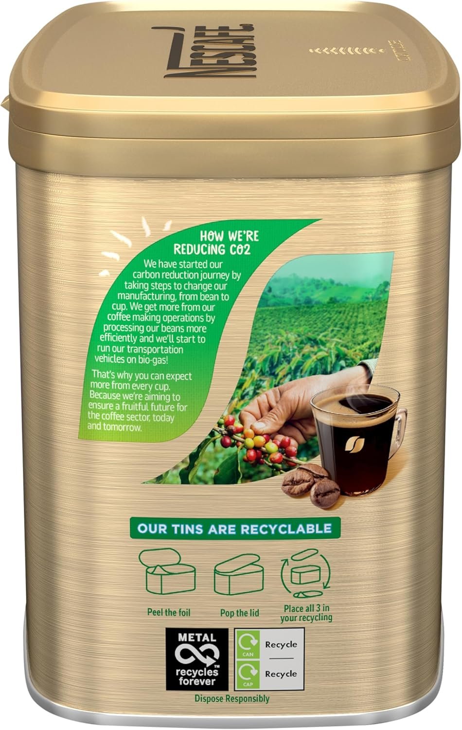 - Hinged lid on our coffee tins use ‘Click-to-Close’ technology for simple and secure re-sealing