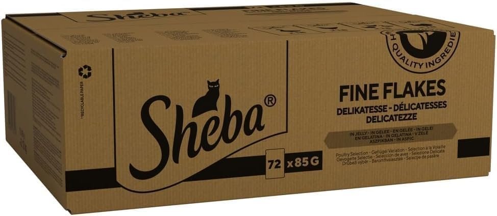 - Items delivered: 72 x 85g bulk food SHEBA Fine Flakes Poultry Collection in Jelly / Multipack with poultry variety / Suitable for any adult cat