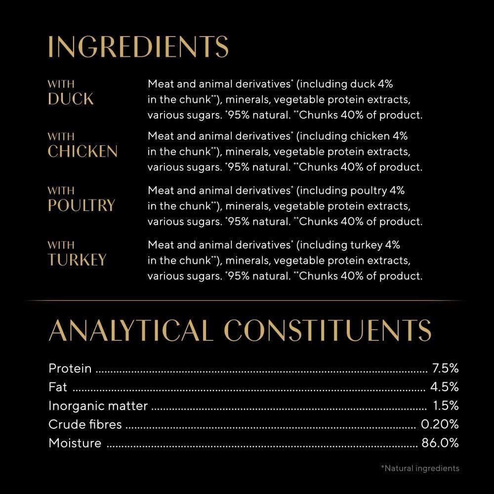 - Multipack with 4 exquisite variety wet cat food pouches in jelly: duck, turkey, poultry and chicken cat food wet pouches in a delicious jelly sauce / Without artificial colours or preservatives